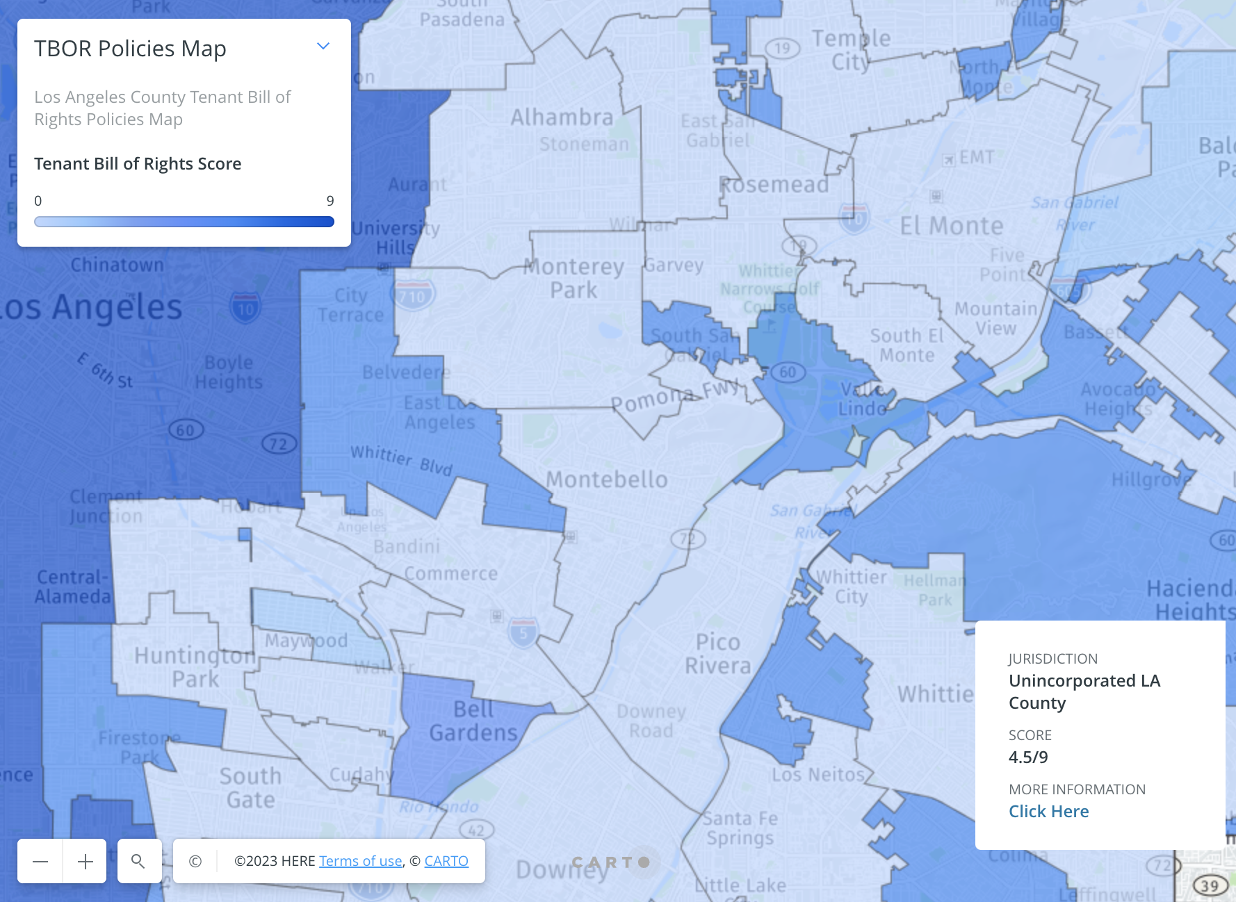 The TBOR map shows how far we’ve come as a movement and how far we still have to go in realizing a more just housing future; KLAH is currently pushing each of the 88 cities in L.A. County to adopt the full slate of TBOR policies. The map’s creators hope it will be a useful tool for policy advocacy, and that it will help renters, advocates, journalists, and lawyers understand the landscape of tenant rights throughout the county. Ultimately, the goal is to equip all Los Angeles-area renters with the same set of rights.
